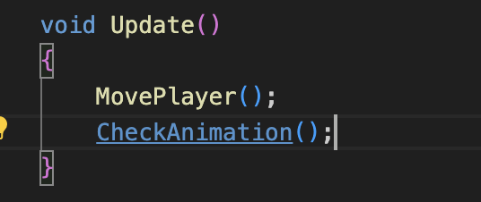 Copy the if-else statement from our CheckAnimation function (which checks for movement) and paste it in the OnCollisionEnter function, inside the if statement that checks for a collision with ground