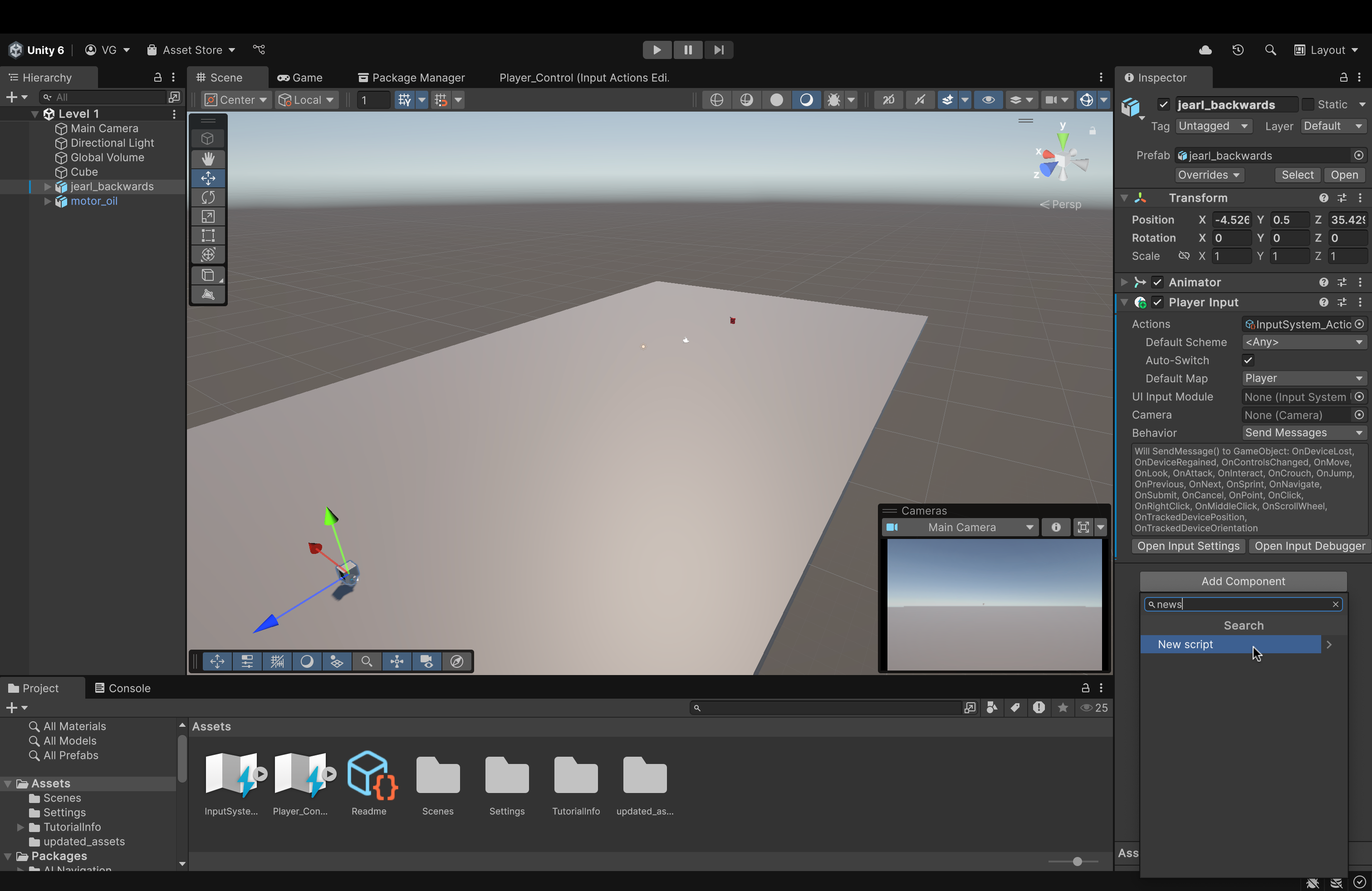 - Name the script something like Player_Movement. Then, click Create and Add. This will create the script and add it as a component to this object (jearl_backwards)